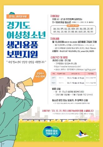 [제주교통복지신문 김강석 기자] 경기도가 ‘2023년 여성청소년 생리용품 보편지원 사업’ 하반기 신청접수를 10일부터 시작한다.