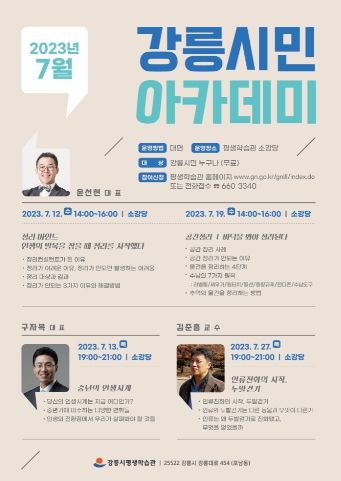 [제주교통복지신문 김강석 기자] 강릉시 평생학습관은 시민들에게 유용한 지식을 제공하고 삶의 질 향상을 위해 ‘7월 강릉시민아카데미’를 운영한다.