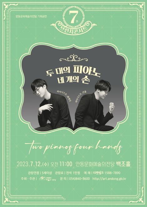 [제주교통복지신문 김강석 기자] 안동문화예술의전당이 7월 브런치 콘서트를 12일 오전 11시 백조홀에서 두 명의 젊은 남성 피아니스트가 표현하는‘두 대의 피아노 네 개의 손’으로 진행한다.
