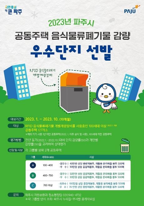 [제주교통복지신문 김강석 기자] 파주시는 음식물류폐기물 발생량을 줄이기 위해 ’2023년도 공동주택 음식물류 폐기물 감량 우수단지 선발‘을 시행한다.