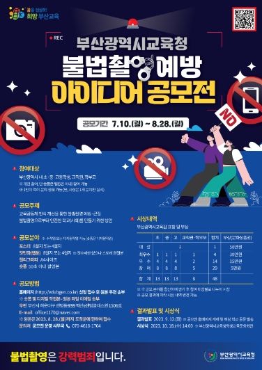 부산광역시교육청은 7월 10일부터 8월 28일까지 부산지역 초·중·고 학생, 교직원, 학부모를 대상으로 ‘불법 촬영 예방 아이디어 공모전’을 운영한다.