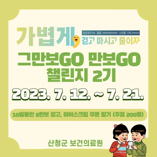 산청군은 일상 속 걷기 챌린지 ‘그만보GO 만보GO 2기’를 운영한다고 10일 밝혔다.