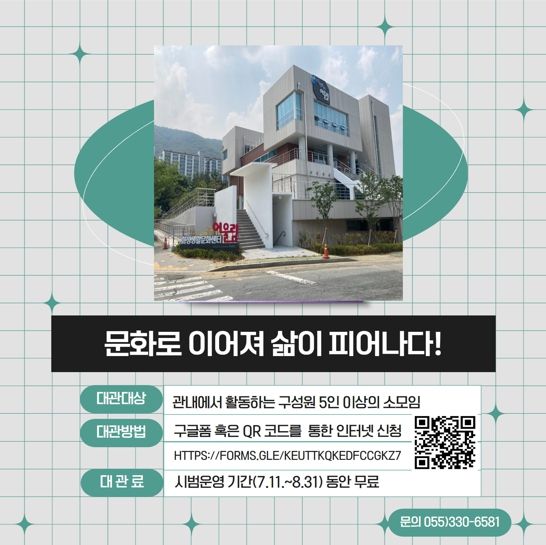 김해시민이라면 누구나 이용 가능하고 5인 이상의 소모임은 동아리실 대관이 가능하다. 시범운영 기간 중에는 대관이 무료이며 대관과 프로그램 신청은 안내문에 있는 구글폼을 통해 하면 된다.