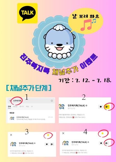 [제주교통복지신문 김강석 기자] 진주시는 진주복지콜센터에서 운영하는 ‘진주복지톡(TALK)’채널을 통해 신속한 복지정보 제공과 시민의 이용편의를 위해 채널 친구추가 이벤트를 실시한다.