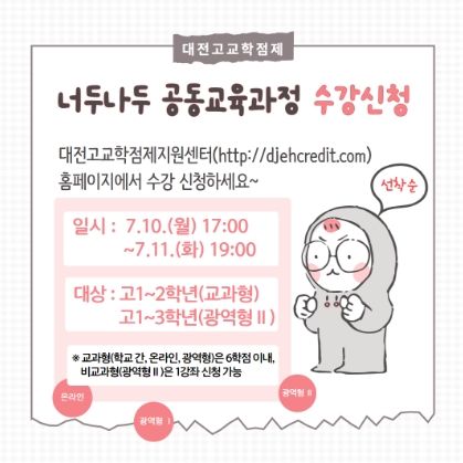 [제주교통복지신문 김강석 기자] 대전광역시교육청은 7월 10일 17:00부터 관내 고등학생을 대상으로 ‘너두나두 공동교육과정 2학기 온라인 신청’을 받는다.