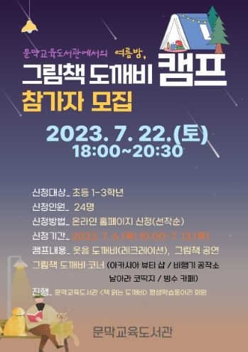 [제주교통복지신문 김강석 기자] 문막교육도서관은 오는 7월 22일 관내 초등 1~3학년을 대상으로 '2023년 여름밤, 그림책 도깨비 캠프'를 운영한다.