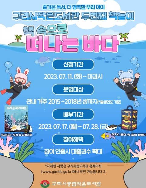 [제주교통복지신문 김강석 기자] 구리시 공립작은도서관은 오는 7월 17일부터 7월 28일까지 ‘책 속으로 떠나는 바다’라는 주제로, 2023년 두 번째 책놀이 키트를 선착순 무료 배부한다.