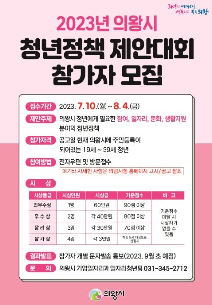 [제주교통복지신문 김강석 기자] 의왕시는 관내 청년들을 대상으로 의왕시 청년에게 필요한 참여, 일자리, 문화, 생활지원 분야의 청년정책을 주제로 ‘2023년 의왕시 청년정책 제안대회’를 개최한다고 밝혔다.
