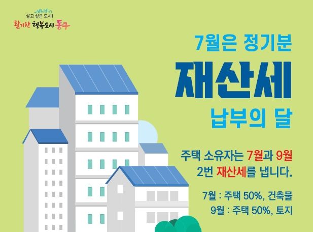 재산세는 매년 7월과 9월 두 차례 고지되며, 7월분 재산세 부과 대상은 매년 6월 1일 현재 동구에 소재한 주택과 건축물 소유자에게 부과된다.