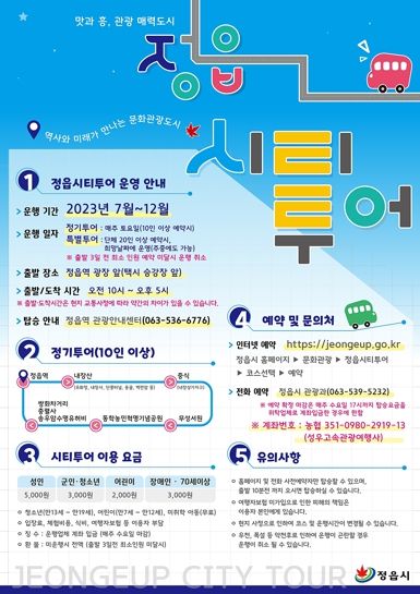 시 관계자는 “정읍시 시티투어를 통해 정읍의 역사·문화를 즐기면서 매력과 맛을 느껴보길 바란다”고 말했다.