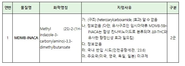 ‘엠디엠비-이나카’는 이미 임시마약류로 지정된 ‘엠디엠비-5비알-이나카’와 구조가 유사해 신체적·정신적 위해 가능성이 있는 물질이다.