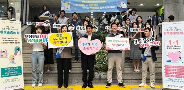 이태훈 달서구청장은 “이번 캠페인을 통해 MZ세대와 기성세대간 소통부족으로 인한 갈등을 예방하고 서로 존중하는 직장문화가 정착되어 행복하고 청렴한 일등도시가 되도록 하겠다.”고 말했다.