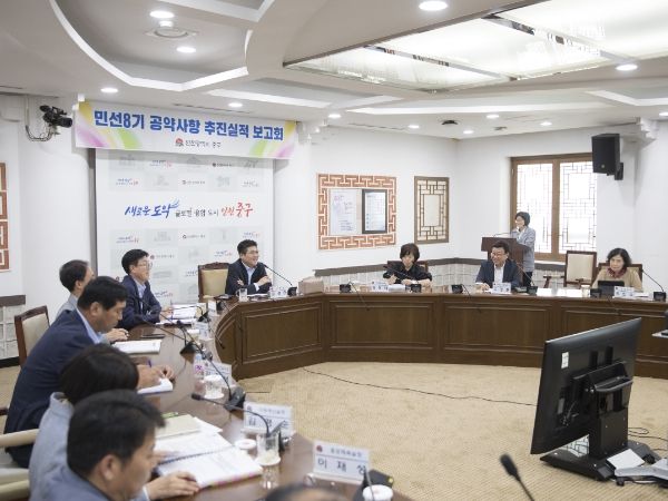 인천시 중구는 지난 7일 중구청 서별관 회의실에서 김정헌 구청장 주재로‘민선 8기 공약사항 추진실적 보고회’를 개최했다.
