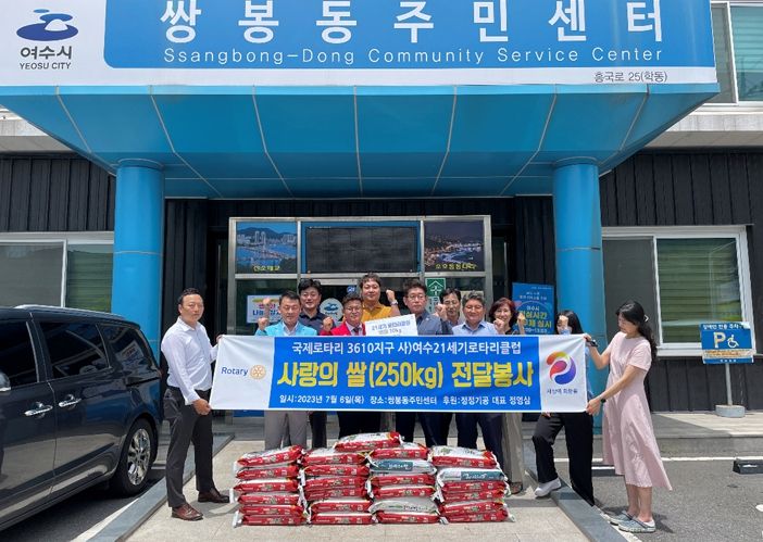[제주교통복지신문 김강석 기자] 국제로타리 3610지구 사단법인 여수21세기 로타리클럽은 지난 6일 쌍봉동주민센터에 75만 원 상당의 ‘사랑의 쌀’ 백미 25kg 10포를 후원했다.