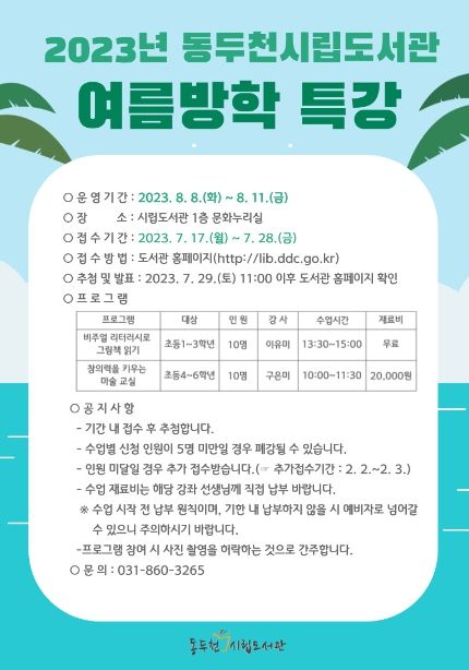 [제주교통복지신문 김강석 기자] 동두천시 평생교육원 시립도서관은 여름방학을 맞이하여 초등 1학년부터 6학년을 대상으로 오는 8월 8일(화)부터 8월 11일(금)까지 방학 특강을 운영한다고 밝혔다.