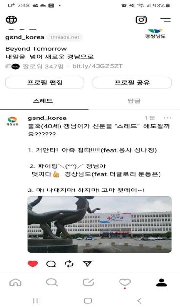 [제주교통복지신문 김강석 기자] 경남도는 한발 앞서는 온라인 소통을 위해 최단 시간 ‘1억 명’ 가입자 기록을 쓴 ‘스레드’로 사회관계망서비스(SNS) 소통 채널 다각화에 나선다고 밝혔다.