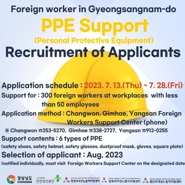 지원대상은 도내 제조업, 건설업, 조선업 등 소규모 사업장(50인 미만)에 근무하는 외국인 노동자이며, 창원, 김해, 양산 외국인노동자지원센터에서 ‘외국인 노동자 안전 보호구 지원사업’ 신청을 받아 300명을 선정하여 지원할 예정이다.
