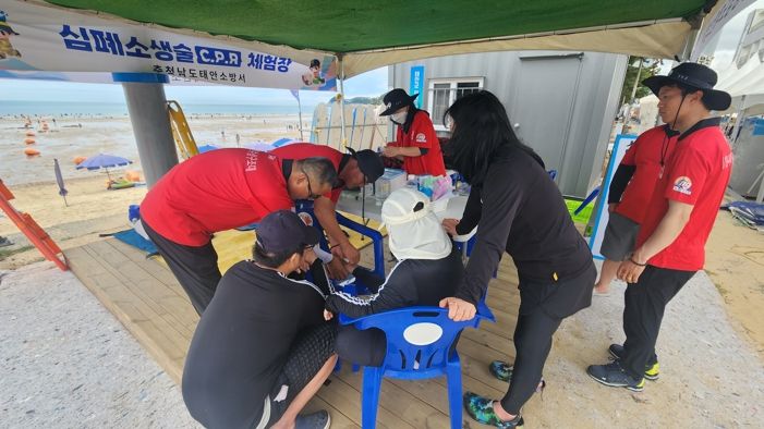 또한 태안소방서에서는 피서객의 안전의식 향상과 응급시 대처능력 상향을 위해 심폐소생술 체험 공간을 마련하여 방문하는 관광객들이 언제든지 쉽고 재미있게 심폐소생술을 배울 수 있도록 교육기재와 교관이 항시 상주하고 있다고 전했다.