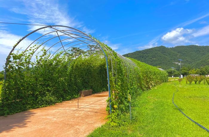 주 산책로에 조성된 덩굴식물터널(L=100m)에는 조롱박과 여주가 영글어 가고, 뒤를 이어 하늘마도 아치형 기둥을 타고 경천섬 관광객들에게 시원한 그늘과 생태학습 공간을 제공하고 있다.