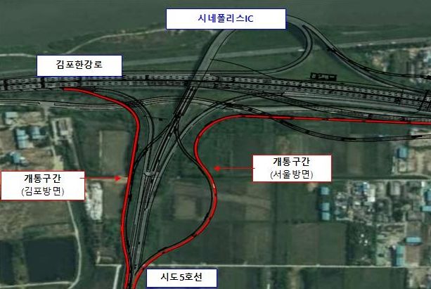 우회도로 구간은 서울방면 380m, 김포방면 260m로, 지난해 10월부터 우회도로 개설공사를 진행해왔으며, 우회도로 개통 후 시네폴리스 내부를 관통하는 도로와 시도5호선을 연결하는 교량 신설공사가 착수될 예정이다.