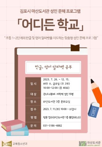 [제주교통복지신문 김강석 기자] 김포시립도서관(관장 이연화) 마산도서관이 성인 문해 프로그램인 ‘어디든 학교’를 오는 7월 26일부터 12월 15일 마산도서관 3층 문화교실에서 운영한다.