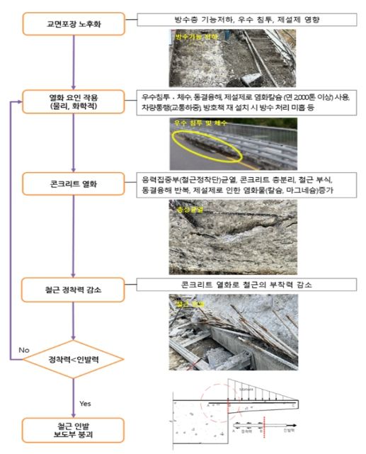 점검과정에서 포장 균열, 캔틸레버 끝단 처짐, 동결융해로 인한 균열, 파손, 슬래브 하면 백태 및 우수유입 증가 등이 관측 보고됐으나, 이에 대한 원인분석과 관련 구조적 특성을 고려한 적시의 보수·보강 조치도 미흡했다.