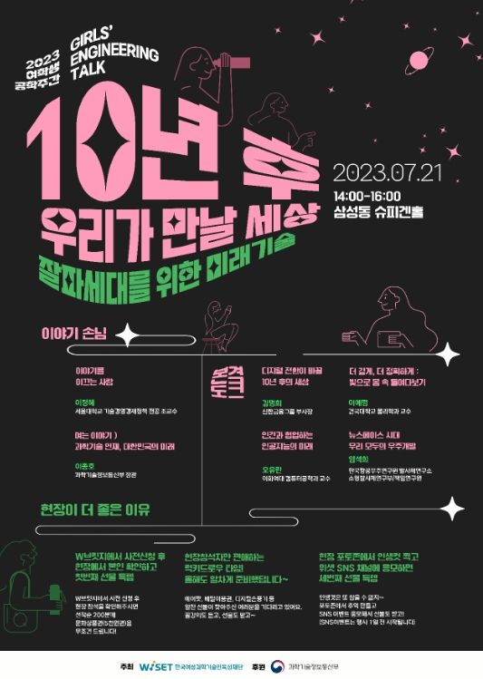 과학기술이 국가 경쟁력을 이끌어 가는 시대에 많은 여학생이 과학기술분야로 진출하여 미래 국가 과학기술 발전에 기여해 주기를 당부하는 과기정통부 이종호 장관의 기조강연을 시작으로, 디지털전환, 인공지능(AI), 우주공학, 기초과학 등 미래 유망기술분야의 여성과학기술인 4인이 각 기술에 대한 소개와 더불어 진로준비를 위한 강연이 진행될 예정이다.
