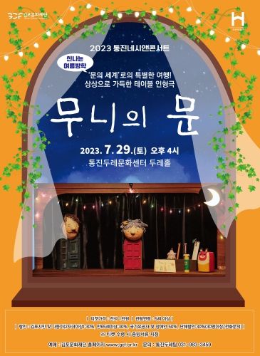 통진두레문화센터 통진네시앤콘서트 4회차 공연인 '무니의 문'은 7월 29일 16시에 통진두레문화센터에서 진행되며, 티켓가는 전석 1만원으로 김포시민 및 다둥이(2자녀 이상) 30% 할인 적용이 가능하다. 예매는 김포문화재단 누리집을 통해 할 수 있다.