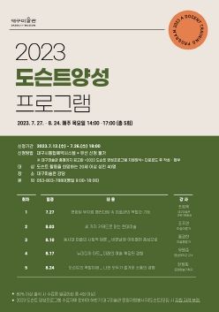 [제주교통복지신문 김강석 기자] 대구미술관은 오는 27일부터 운영하는 ‘2023 대구미술관 도슨트 양성프로그램’의 수강생을 7월 12일부터 26일까지 모집한다.