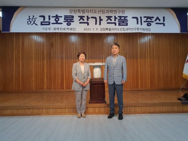 [제주교통복지신문 김강석 기자] 강원특별자치도산림과학연구원은 11일 본원 대회의실에서 고(故) 김호룡 작가 작품 기증식을 가졌다. 기증식에는 산림과학연구원 원장을 비롯하여 작품을 기증한 고(故) 배진태 님의 부인인 백태분 여사가 참석했다.