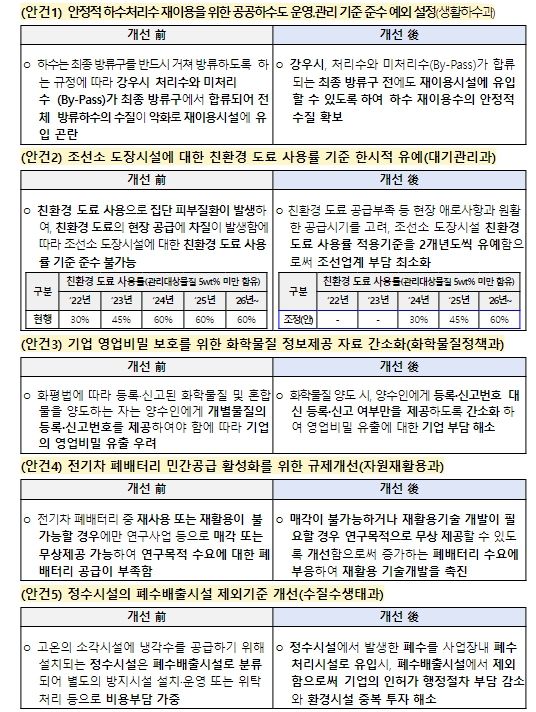 이번 안건은 현장여건을 고려하여 개정이 예정된 규정의 적용시기를 앞당기거나, 기업에 과도한 부담이 되는 규제의 적용을 유예하는 등 급변하는 행정환경을 고려해 환경규제를 합리화한 것이다.