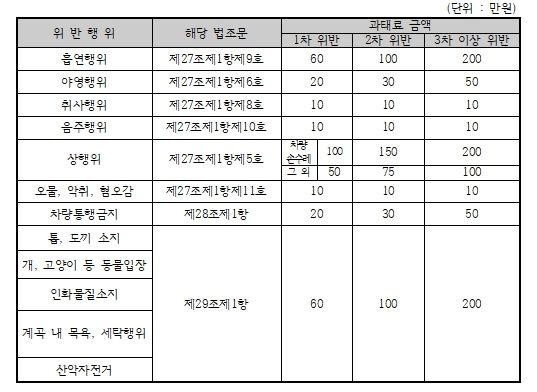 위반 시에는 사안에 따라 과태료를 부과하며 차박(야영), 차량통행금지 위반의 경우 50만원 이하, 개·고양이 등 동물을 데리고 입장하는 경우에는 200만원 이하의 과태료가 부과된다.