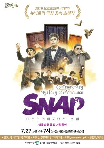 미스터리 장르와 마술의 결합으로 환상의 세계를 선보이는 ’스냅‘은 독창적인 마술을 기반으로 마임, 슬랩스틱 코메디, 미디어 아트 등을 결합해 아동 뿐만 아니라 온 가족이 즐길 수 있는 넌버벌 매직컬 공연이다.