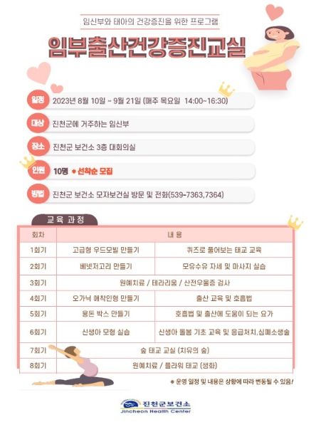 [제주교통복지신문 김강석 기자] 진천군보건소는 관내 임산부를 대상으로 행복한 태교와 건강한 출산 교육을 위한 하반기 ‘임산부 출산·건강증진 교실’ 참여자를 모집한다고 12일 밝혔다.