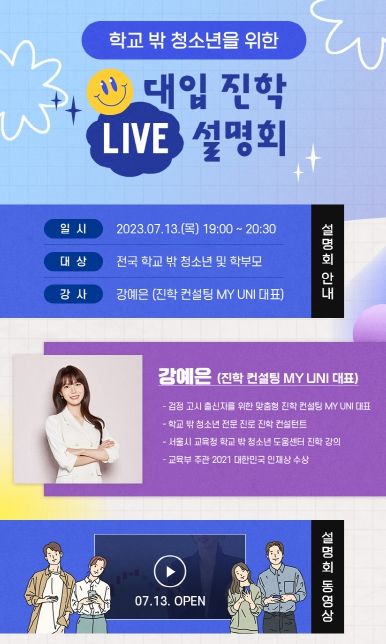 저녁 7시부터 8시 30분까지 강남인강 유튜브 채널을 통해 진행하는 이번 설명회는 검정고시 맞춤형 진학 컨설팅 MY UNI의 강예은 대표가 맡는다. 주요 내용으로 ▲학교 밖 청소년 대학 진학 HOW TO DO ▲전형별 특징 및 지원 전략 ▲입학 사례 기반 대학 지원 범위 및 우선순위 설정 ▲학교 밖 청소년 지원 가능 대학 및 전형 ▲비교 내신 개념 소개 및 환산 방식 완벽 정리 등을 다룬다.
