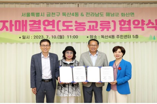 [제주교통복지신문 김강석 기자] 금천구는 7월 10일 독산4동 주민자치회가 전남 해남군 화산면 주민자치위원회와 독산4동 주민센터에서 도농 교류를 위한 자매결연을 체결했다고 밝혔다.