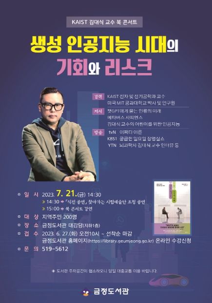 [제주교통복지신문 김강석 기자] 부산 금정구 금정도서관에서는 오는 7월 21일 오후 2시 30분 금정도서관 대강당에서 KAIST 뇌과학자'김대식 북 콘서트'를 개최한다.