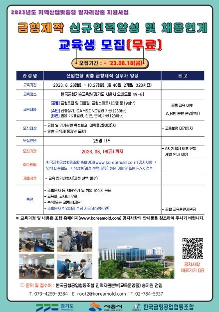 ‘산업현장 맞춤 금형제작 실무자 양성과정’은 금형 및 기계 관련 배경지식이 있거나 관심 있는 구직자를 대상으로 오는 8월 28일부터 10월 27일까지 한국금형기술교육원(시흥시 오이도로 49-6)에서 진행된다.