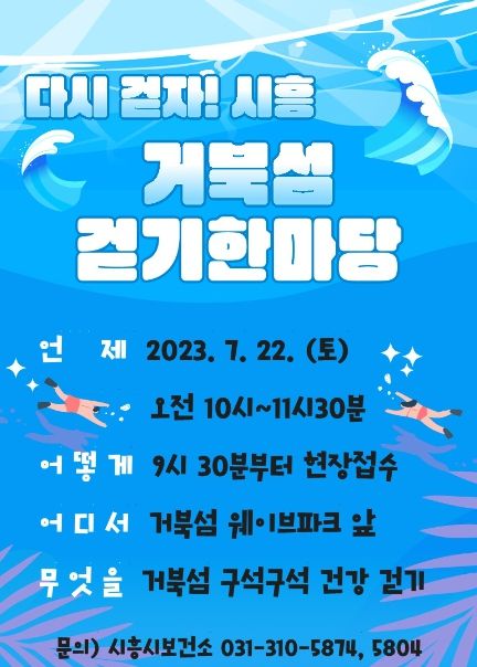 [제주교통복지신문 김강석 기자] 시흥시보건소 건강도시과는 거북섬의 뛰어난 자연경관을 체험하며 즐거운 걷기 경험을 제공해 시민의 생활 속 걷기 습관을 형성하고자 거북섬 해양축제 기간(7월 21일~23일)에 ‘거북섬 걷기 한마당’을 개최한다.