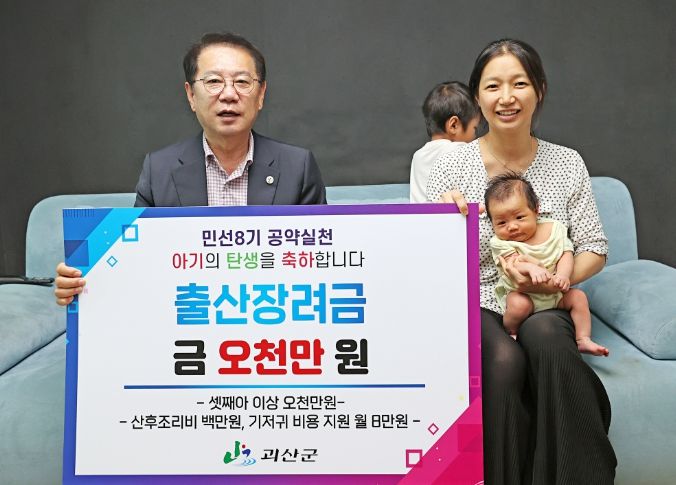 송인헌 괴산군수는 지난 11일 넷째아를 출산한 권 씨 부부 집을 방문해 출산장려금 5천만 원의 지원내용을 설명하고, 출산축하 꾸러미를 직접 전달했다.