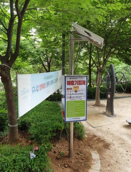설치된 해충기피제 자동분사기는 태양광 전력을 활용한 배터리 충전식으로 별도의 전기 공급 없이도 상시 작동된다. 중앙 작동버튼을 누른 후 손잡이를 당기면 분사되는 방식으로 사용방법도 간편하다.