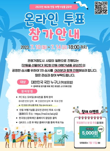 온라인 투표는 누구나 참여 가능하다. 출품작 이미지와 설명을 참고해 안동 관광을 대내외에 홍보하고 관광객의 구매력을 높일 수 있는 작품에 3개씩 투표할 수 있다. 전화번호 인증 방식을 사용하기 때문에 투표 기회는 1회만 주어져 공정성을 높였고, 투표 참가자 중 무작위로 60명을 추첨해 5,000원 상당의 커피 쿠폰을 제공할 예정이다.