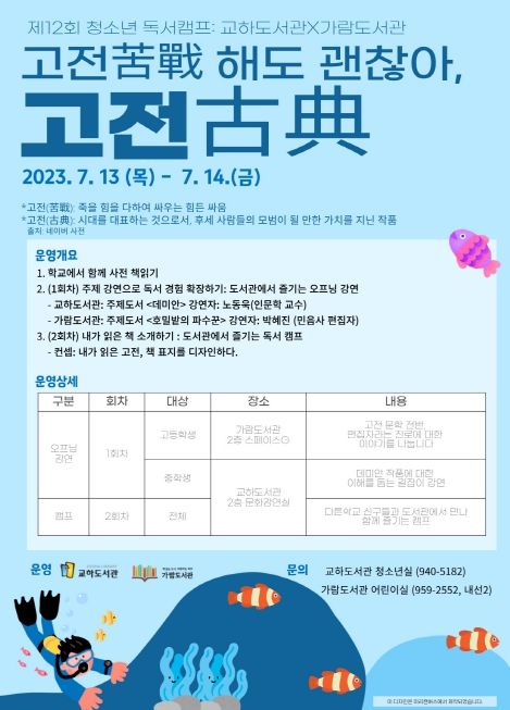 프로그램 담당자들은 “이번 독서캠프를 통해 청소년들이 고전에 대해 새롭게 인식하고, 도서관에서 책을 매개로 다양한 의견을 나누며, 즐거운 경험을 하길 바란다”라고 기획 의도를 밝혔다.