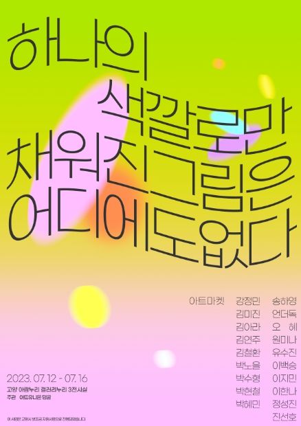 [제주교통복지신문 김강석 기자] 고양특례시는 오는 12일(수)부터 20일(목)까지 고양아람누리 갤러리누리 1관에서 ‘아트유니온 덩굴’의 첫 기획전 ‘하나의 색깔로만 채워진 그림은 어디에도 없다’를 개최한고 밝혔다.