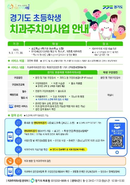 참여 방법은 ‘덴티아이경기’ 앱에 가입하여 사전 문진표 작성과 온라인 구강보건교육을 마친 뒤 희망하는 치과주치의 지정 의료기관에 전화 예약 후 방문하면 된다. 치과주치의 지정 의료기관은 고양시 보건소 홈페이지 및 ‘덴티아이경기’ 앱에서 확인할 수 있다.