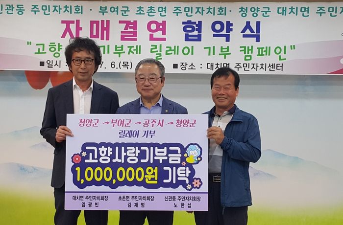 초촌면 주민자치회는 최근 청양군 대치면주민자치센터에 방문해 부여, 공주, 청양의 상생발전을 위한 고향사랑기부금을 상호기부했다. 이번 기탁식은 부여군(초촌), 공주시(신관), 청양군(대치) 주민자치회에서 자발적으로 마련해 성사됐다.