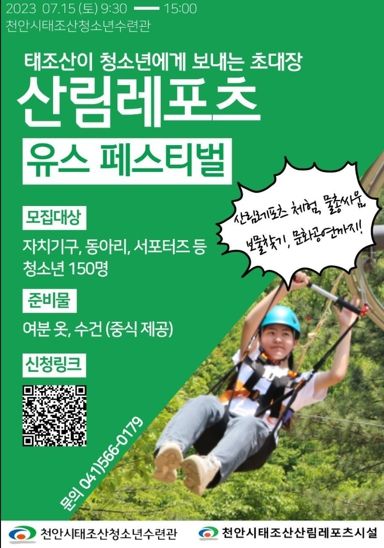 천안시태조산청소년수련관과 천안시태조산산림레포츠단지의 협력으로 개최하는 이번 페스티벌은 자치기구, 동아리, 서포터즈 등 청소년 150여 명을 대상으로 산림레포츠시설 체험, 문화공연, 워터워즈 등 다양한 프로그램을 진행한다.