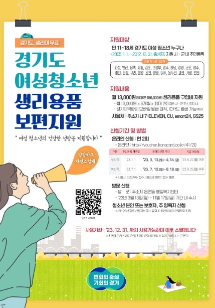 이번 사업은 여성 청소년들의 건강한 성장을 지원하고 경제적 부담을 줄이기 위해 생리용품 구입비를 경기지역화폐로 지원하는 사업으로 1인당 월 1만 3000원, 연간 최대 15만 6000원이 지급된다.