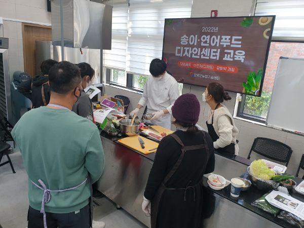 군은 지역에서 생산된 식재료를 활용한 대표음식 개발과 창업의 모티브 제공, 농특산물의 부가가치를 높여나가기 위해 송이연어푸드 디자인센터 교육을 진행하고 있다.