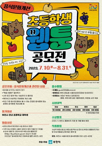 [제주교통복지신문 김강석 기자] 부천시는 어린이의 올바른 식습관 형성 및 건강한 음식문화 실천을 위해 ‘음식문화개선 초등학생 웹툰 공모전’을 개최한다.